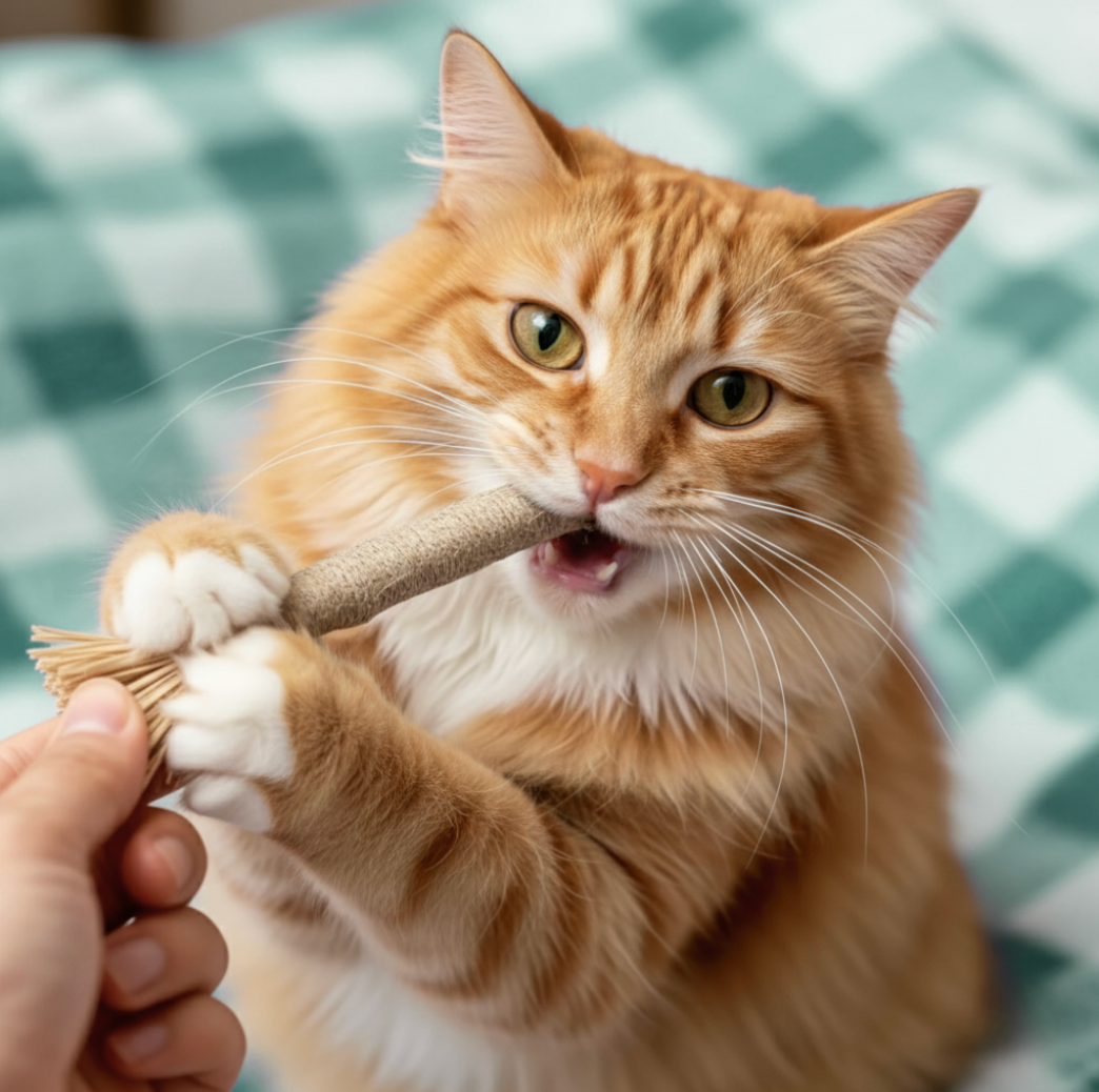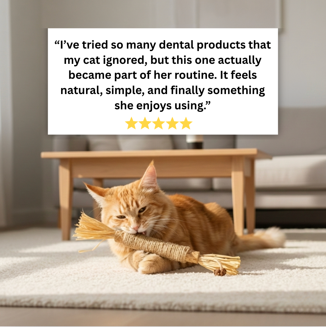 Calmara works through natural chewing action—when your cat gnaws on the stick, it helps mechanically disrupt plaque buildup before it hardens into tartar. This isn't a cure or replacement for vet care, but it's a preventative tool that supports oral health over time. Think of it like flossing for humans: it's not perfect, but consistent use makes a real difference. Most customers notice fresher breath within 2-4 weeks.